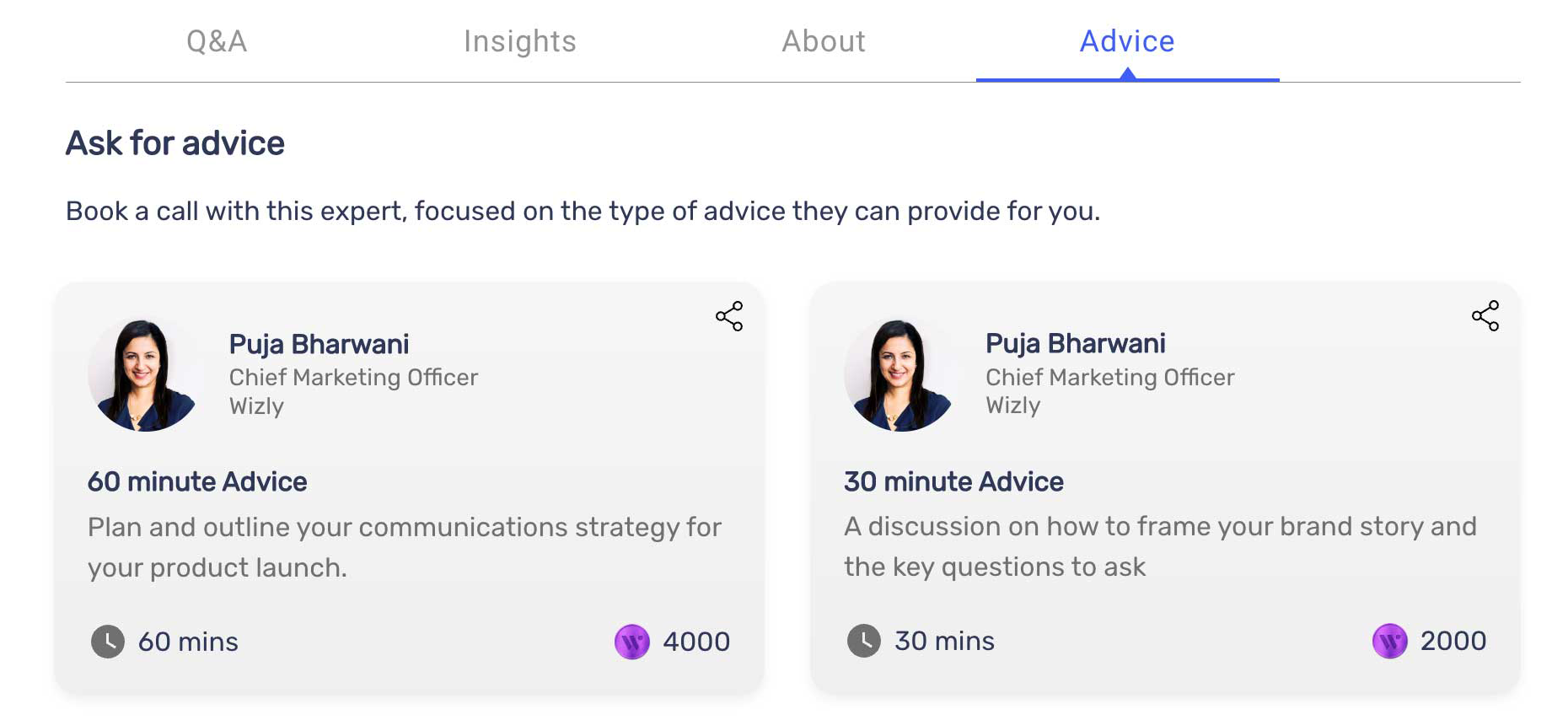 With Wizly, Independent Professionals have the chance to drive traffic to their Wizly account through social media, email marketing, blogs, and more. Independent Professionals with more significant followings now have the ability to reach their audiences on a more personal level through Projects and Advices on the platform.