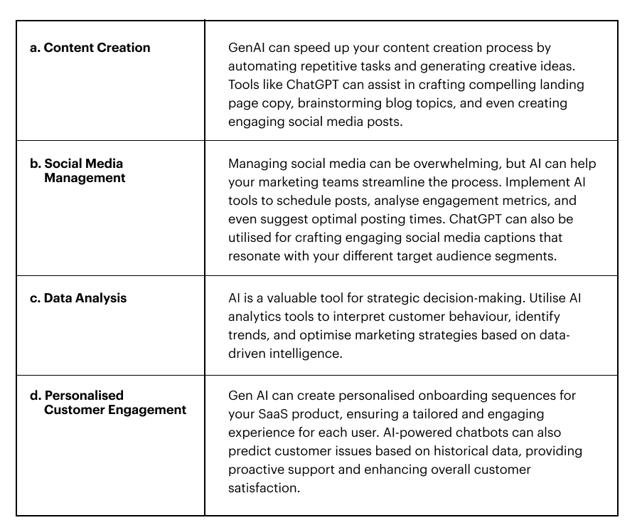 In the realm of B2B or SaaS marketing, potential applications are vast. From customer onboarding to lead nurturing, Gen AI can be a game-changer. While content generation is a common application of Gen AI, let's explore some fascinating real-life use cases that go beyond the usual suspects: